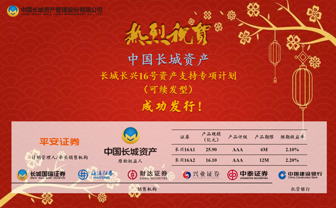 9月10日,中國長城資產(chǎn)在上海證券交易所成功發(fā)行長城長興16號(hào)資產(chǎn)支持專項(xiàng)計(jì)劃。本期產(chǎn)品發(fā)行規(guī)模42.2億元,票面加權(quán)融資利率2.14%,其中優(yōu)先級(jí)A1檔發(fā)行規(guī)模25.9億元,期限6個(gè)月,發(fā)行利率2.1%;優(yōu)先級(jí)A2檔發(fā)行規(guī)模16.1億元,期限12個(gè)月,發(fā)行利率2.2%。